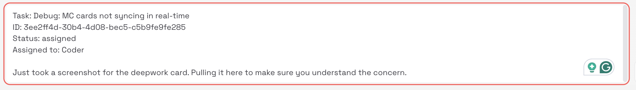 Copy the task ID. Start a deep session. Full context loads automatically. Dive deep without losing the paper trail. Results flow back to Command.