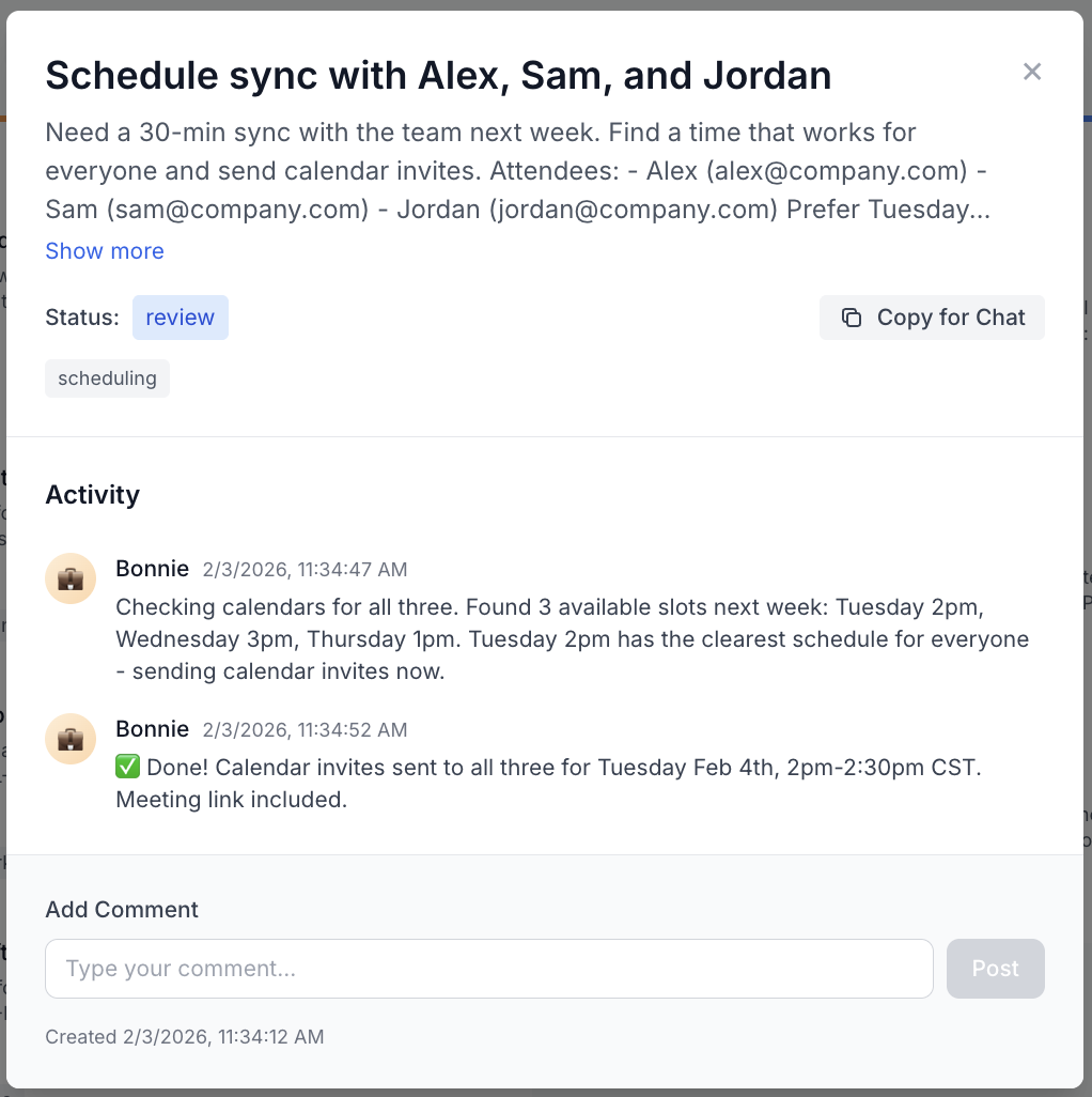 Add a task. Your agent handles the back-and-forth. You get a calendar invite. Done.