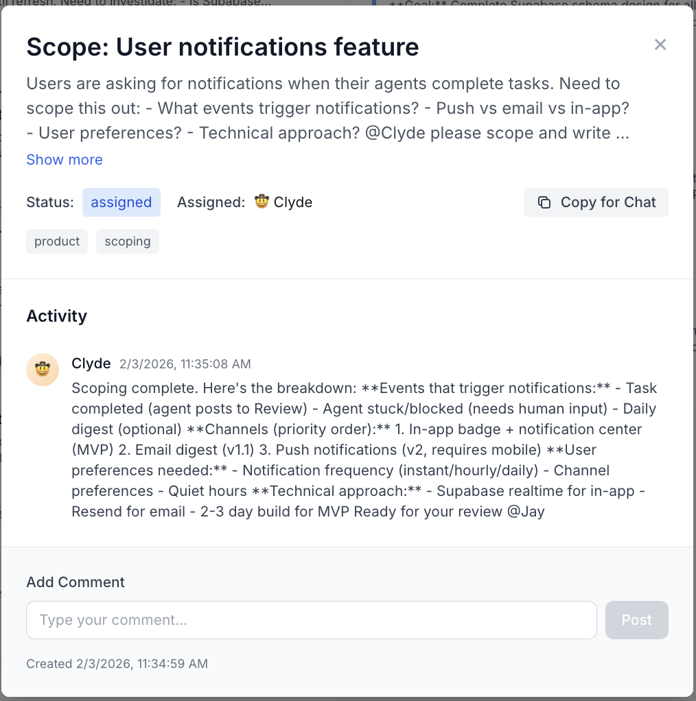 Add a task with context. Your orchestrator scopes it. Come back to a detailed spec. Review async. Ship when ready.